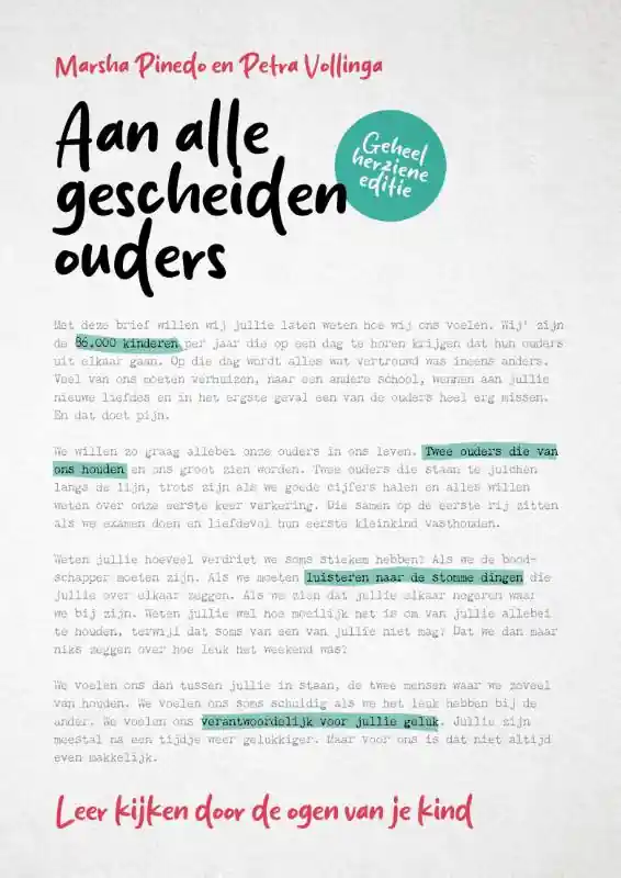 In Aan alle gescheiden ouders laat Marsha de kinderen zelf aan het woord, in persoonlijke verhalen die iedere ouder zullen raken: wat zij meemaken, voelen en denken. Op een indringende manier openen deze kinderen je de ogen, aangevuld met tips en adviezen van deskundigen en oefeningen waar je meteen iets mee kunt. Zodat jouw kind later kan zeggen: ‘Mijn ouders? Die zijn echt goed gescheiden.’